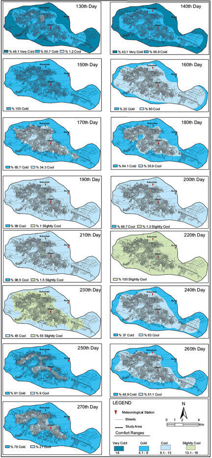 Figure 9 shows the spatial distribution of mean daily minimum PET values. It is seen that on day 130, the rural area (48.1% of the study area) was under very cold stress, urban and suburban areas (50.7%) were under cold stress, and a portion of the urban area (1.2%) was under the effect of a cool range. On day 140, 43.1% of the area was under the effect of very cold stress and 56.9% under cold stress. Very cold stress was observed in rural areas and cold stress was observed in urban and suburban areas. On day 150, cold stress was determined throughout the study area. On day 160, 20 and 80% of the study area experienced cold stress and cool, respectively, and on day 170, 65.7% of the area (rural) was under the effect of cold and 34.3% (suburban and urban) experienced a cool range. On day 180, a cool range was observed in urban areas (35.9% of the study area), and cold stress was felt in suburban and rural areas (64.1%). From day 190 to 210, the vast majority of the study area experienced cool and slightly cool ranges in dense building areas. On day 190, the slightly cool area corresponded to 1% of the study area, whilst this percentage was 1.3% on day 200 and 1.5% on day 210. On day 220, a slightly cool range was experienced in the study area. On day 230, 55% of the study area (urban and suburban) faced a slightly cool range, while 45% (rural) experienced a cool range. On day 240, 37% of the study area is under the effect of a cold range and 63% is under a cool range, while on day 250, 91.0% of the area is under a cold range and 9.0% under a cool range. On day 260, 48.9% of the area was under a cold stress and 51.1% faced a cool range, while on day 270, 79% of the area was under a cold stress and in 21% the cool range was dominant. From day 240 to 270, rural areas were under a cold stress. Suburban areas were under the effect of a cool range on day 240 and a cool range was observed on other days in urban areas.