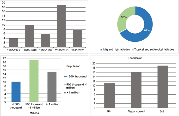 Figure 1a shows that more than 30% of the papers were published in the first decade of the 21st century; in the whole period (Fig. 1b), two thirds have been focused on middle and high latitudes, and two thirds on cities with more than 500 000 inhabitants (Fig. 1c). In 25% of the papers the hygrometric variable used (Fig. 1d) is relative humidity (RH), in 33% some variable measuring atmospheric vapor concentration (vapor pressure, specific humidity, mixing ratio, absolute humidity or dew point temperature) is utilized, and in the remaining 42% both variables are employed. Therefore, obtaining conclusions is not easy since the publications are very disparate in terms of geographical area, size of the cities and humidity variables analyzed (Oke et al., 2017). Moreover, in the appendices of 25% the articles the results clearly indicate an excess of urban moisture; another 25% report moisture deficits in the city, and the remaining 50% show that one situation occurs in certain periods and the opposite occurs in others.