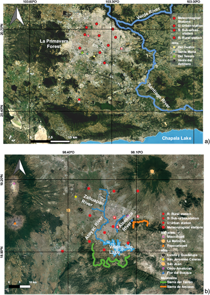 This paper compares the urban effects on atmospheric humidity in two Mexican metropolitan areas, both tropical highlands: Guadalajara and Puebla. In Mexico, a metropolitan area is defined as an urban concentration of complete municipalities in a single unit that share a central city and are highly functionally interrelated, or an urban center with more than one million inhabitants even if it has not exceeded its municipal limit, or cross-border urban centers with more than 250 000 inhabitants (SEMARNAT, 2020). Since the study areas do not cover the total surface of the officially called metropolitan areas, but exceed the limits of the cities that give them a name, and for the sake of conciseness, in this article they will be called metropolis of Guadalajara and Puebla, or simply Guadalajara or Puebla.