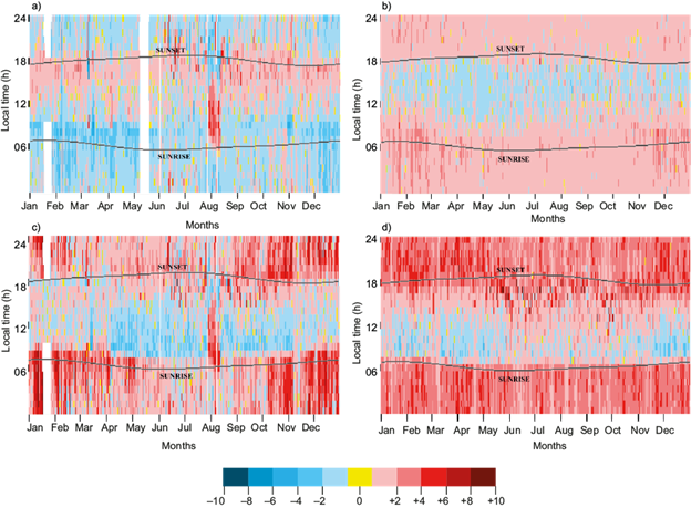Oke et al. (2017, chpt. 9) remark on how limited the literature on the subject is, as mentioned above, and the difficulty of comparing studies using different humidity variables. According to the literature reviewed, the conclusion obtained by these authors is that the hypothetical causes of urban moisture excesses or deficits are not entirely clear for any city. They state that in middle and high latitudes during summer there is an urban moisture deficit in the diurnal period and an excess during the nocturnal period. The first one is mainly the result of a lower vapor pressure in the city due to its higher impermeability, which is exacerbated by a higher vertical transport and mixing in cities (due to their higher roughness and thermal turbulence) that enhance exchanges between near-surface air and drier air above the canopy (urban, suburban, or rural). At night, the urban moisture excess probably results from the decrease in dew formation due to the urban heat island and anthropogenic water vapor emissions.