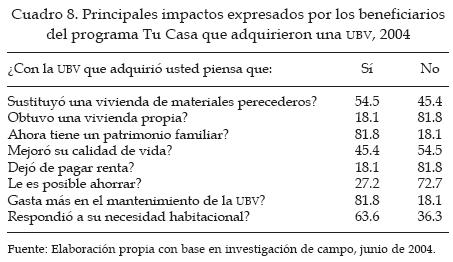 Así también resulta relevante que la mayor proporción de estas familias (54.5%) mencionó que la adquisición de la UBV no necesariamente mejoró su calidad de vida, lo cual de acuerdo con las impresiones rescatadas en la investigación tiene mucho que ver con el sentimiento de haber perdido lo que ellos consideraban parte de su patrimonio familiar, pues es importante notar que cerca de la mitad (45.4%) de estos hogares contaba con una vivienda construida con materiales duraderos (cuadro 8).