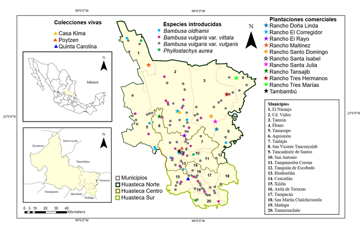 Figura 1: Ubicación en la Huasteca Potosina, México, de colecciones vivas, plantaciones comerciales de bambú y localidades con algunas de las especies exóticas de bambú.