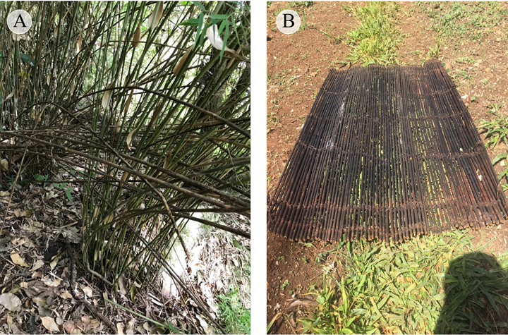 Las otras dos especies nativas útiles son Otatea acuminata y Rhipidocladum racemiflorum. La primera se registró al norte del municipio El Naranjo, en donde se utiliza para elaborar cestería (Fig. 4). Esta especie crece muy distante de los artesanos que la usan, quienes invierten una o dos jornadas para recolectarla y transportarla a lomo de burro o en camioneta a su vivienda. Un artesano del ejido El Platanito, en el mismo municipio, tiene más de 50 años fabricando productos con O. acuminata y para mantener los culmos frescos, húmedos y manipulables, los cubre con varias capas de fibra y hojas de la misma planta y los humedece periódicamente. Las cestas se elaboran en las viviendas y se venden en sus casas, en puestos a orilla de la carretera o son adquiridos por revendedores que los comercializan en otros municipios. La especie Rhipidocladum racemiflorum es un bambú con culmos de 0.5 a 1 cm de diámetro; en algunas comunidades de Xilitla se utiliza para elaborar esterillas, que localmente los nombran copiles, y se usan como parrilla para ahumar chile (Fig. 5).