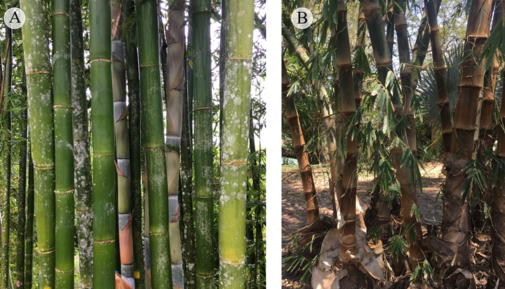 Figura 7: Dos especies de bambú introducidas en la Huasteca Potosina, México. A. Bambusa oldhamii Munro; B. Dendrocalamus asper Backer ex K. Heyne.