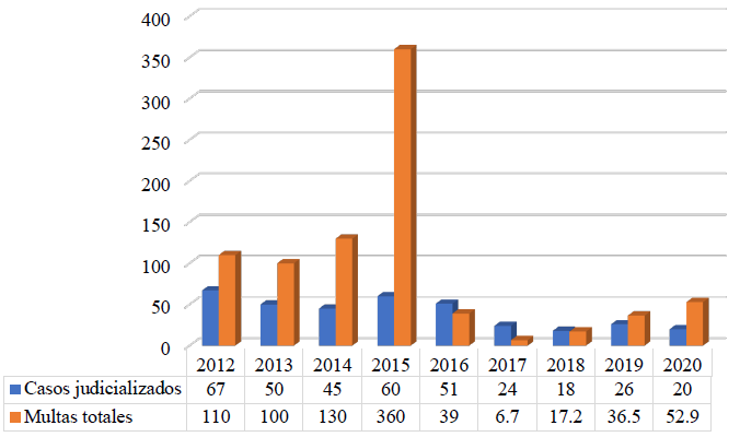 A partir de los datos anteriores se puede apreciar un relajamiento de la política de combate a los monopolios y a las prácticas anticompetitivas en Estados Unidos durante la segunda mitad de la década pasada. Aun descontando el atípico año de 2015, que tuvo un pico en el valor de las multas impuestas, en promedio tanto el total de casos judicializados como el monto de las multas se desplomaron a partir del año 2016, en coincidencia con una política comercial más restrictiva aplicada durante la administración de Donald Trump. El promedio de casos judicializados y las multas totales entre 2012 y 2014 es superior a tres veces al registrado entre 2016 y 2018. Esto envió al mercado una señal de relajamiento en torno de la persecución, por lo que la actividad anticompetitiva se volvió más lucrativa desde un punto de vista netamente pragmático.
