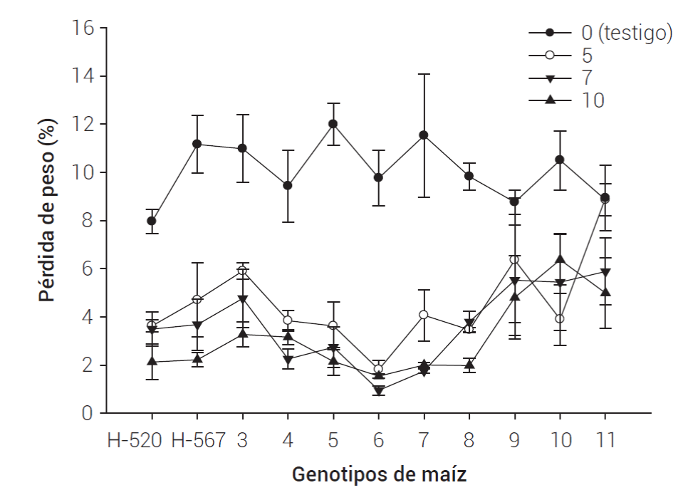 Al observar el efecto de los factores analizados sobre las variables respuesta, todos los genotipos de maíz registraron control favorable del gorgojo, estimado con base en la pérdida de peso (Figura 1). Los materiales con concentración 0 g de epazote kg-1 de semilla (testigo) tuvieron reducciones de peso de 8 a 12 %, lo que concuerda con lo reportado por Caneppele et al. (2003), quienes registraron pérdidas de peso en maíz infestado por gorgojo de 0.36 % por día, en promedio, mientras que Derera et al. (2014) observaron pérdidas de peso de 19 a 56 % después de cinco meses de infestación.