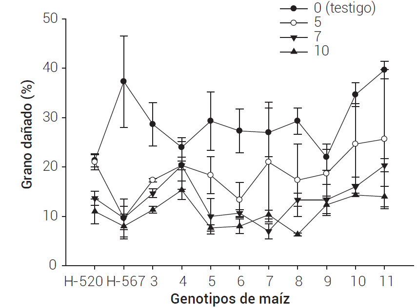 Los genotipos de maíz con mayor pérdida de peso, a pesar del tratamiento, fueron el híbrido CLTHY13002 y los sintéticos Amarillo Ocotito y Amarillo Dentado; solamente el Sintético Amarillo Dentado con el tratamiento de 5 g de epazote kg-1 de semilla registró el mismo comportamiento que su homólogo en el testigo. En cuanto al porcentaje de grano dañado, los genotipos de maíz respondieron de manera diferente en función de la concentración de polvo empleado (Figura 2). Todos los materiales registraron reducciones en el porcentaje de daño; el H-567 sobresalió, al reducir entre 28 y 29 puntos porcentuales el daño en todos los tratamientos con epazote.