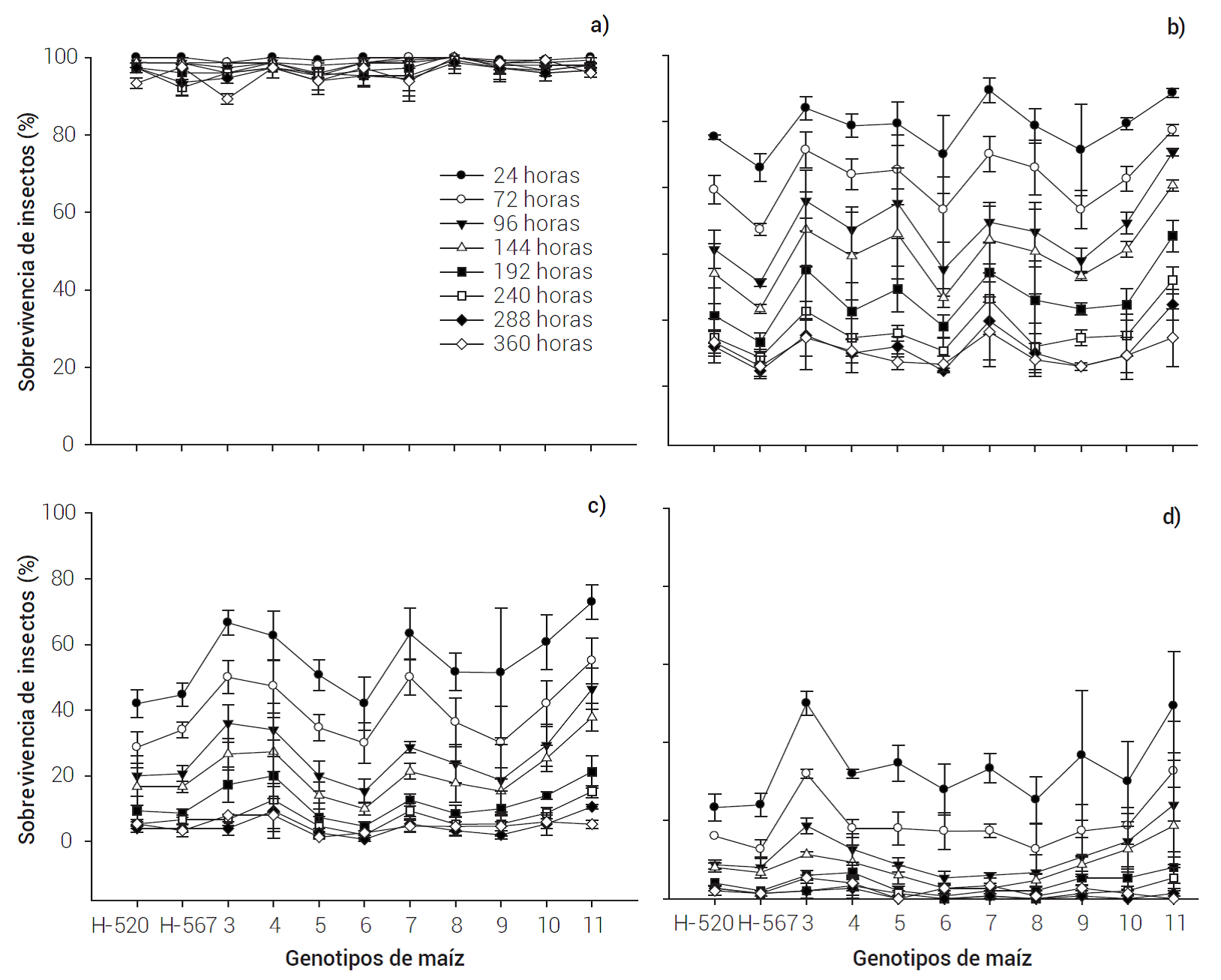 El genotipo que registró mayor pérdida de peso fue el Sintético Amarillo Dentado con una reducción de 7.17 puntos porcentuales con respecto a su peso inicial mientras que el material que presentó menor pérdida de peso fue el híbrido CLTHW14001 con 3.52 %. Para la variable porcentaje de grano dañado no se detectaron diferencias estadísticas, aún cuando las diferencias entre el material más afectado y el de menor daño (Sintético Amarillo Dentado vs. híbrido CLTHW14001) fue mayor a 10 % (Cuadro 2). La variable sobrevivencia del insecto presentó diferencias (P ≤ 0.05) hasta las 264 h (11 d); después, todos los genotipos de maíz mostraron similitud estadística (P ≥ 0.05) y mantuvieron un intervalo de 25 a 35 %. Los porcentajes más bajos de sobrevivencia del insecto se presentaron en los híbridos H-567 y CLTHW14001, mientras que el Sintético Amarillo Dentado siempre mantuvo un porcentaje alto, entre 78 y 35 %, durante el periodo de 24 a 264 h (Cuadro 3).