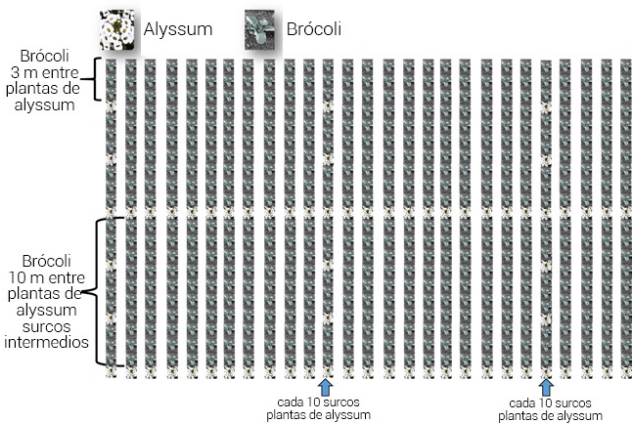 Para los tratamientos con aplicación de fructosa se realizaron aspersiones semanales de una solución al 5 %, en el 10 % de las plantas de brócoli y se utilizaron 20 L de la mezcla por hectárea; la aspersión se realizó de manera mecanizada con un tanque montado al tractor en uno de cada 10 surcos. En los tratamientos en los que se incorporaron plantas de alyssum, éstas tenían una edad de 30 días y ya contaban con flores al momento del trasplante. Estas plantas fueron establecidas en el campo de cultivo el mismo día del trasplante del brócoli. Se colocaron 1000 plantas con flores por hectárea, en un surco se colocó una planta de alyssum (intercalada entre plantas de brócoli) cada tres metros, ésto se repitió cada 10 surcos. En cada uno de los surcos intermedios se colocó una planta de alyssum cada 10 m; de esta manera, se formó una cuadrícula (Figura 1), procurando que las estaciones de alimentación para los parasitoides estuvieran uniformemente repartidas en toda la superficie. Las plántulas de alyssum las proporcionó la empresa Grupo U, propietaria de los campos donde se estableció el experimento.