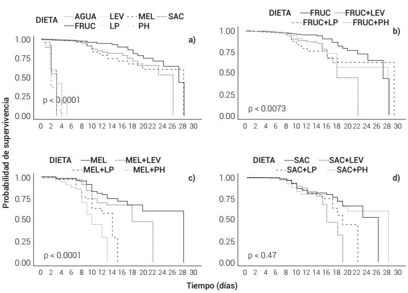 La longevidad de los parasitoides alimentados con la combinación de carbohidratos y proteínas en ninguno de los casos superó los resultados obtenidos con fructosa; este tratamiento incrementó de forma significativa la probabilidad de supervivencia de los parasitoides. En algunos casos se observó que, cuando a los carbohidratos se les adicionó alguna proteína, se redujo significativamente la longevidad de los parasitoides (Figura 2b y c), esto podría ser originado por una menor aceptación del alimento. Por su parte, Van Neerbos et al. (2020) demostraron que la composición de las mezclas de azúcares y proteínas tiene un efecto que puede incrementar o reducir la longevidad de algunos parasitoides.