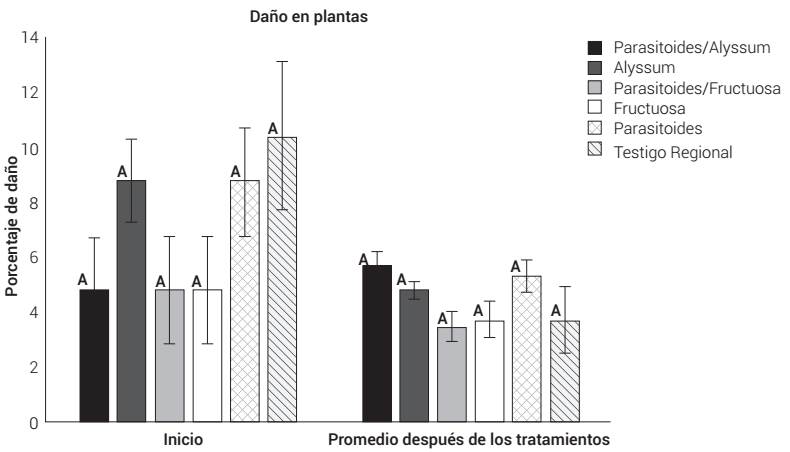 Al porcentaje de plantas con daño se le aplicó la transformación angular (arcoseno p), donde p fue el valor proporcional de plantas dañadas; para esta variable se analizaron los datos al principio y el daño promedio al final del experimento. El porcentaje de parasitismo se calculó sobre larvas de los estadios 3 y 4 (grandes), ya que son las susceptibles a parasitismo por D. insulare. Se consideró el número de parasitoides emergidos en relación con la cantidad total de organismos emergidos (parasitoides + palomillas), aunque se analizó estadísticamente la cantidad de parasitoides emergidos al principio y el total acumulado al final del experimento; de manera similar, se analizaron los datos de la variable número de larvas de tercer y cuarto estadio por planta. Para evaluar el efecto de los tratamientos sobre las variables medidas se realizó un análisis de varianza y prueba de comparación de medias (Tukey, P ≤ 0.05), se utilizó el lenguaje de programación R, versión 4.0.5 (R Core Team, 2021).