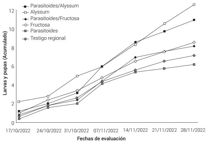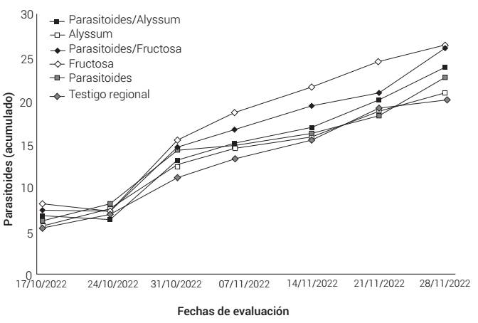 Al inicio del experimento, antes de la primera liberación de parasitoides, no se detectaron niveles de parasitismo estadísticamente diferentes entre tratamientos (F5,24 = 2.50, P = 0.0584). En la última evaluación, en el tratamiento T6 (testigo regional) se registró 42 % de parasitismo, mientras que en el tratamiento T1 (fructosa) el nivel de parasitismo alcanzó el 82 %; estos tratamientos fueron estadísticamente distintos en el número acumulado de parasitoides emergidos (F5,24 = 3.35, P = 0.0194) (Cuadro 2); en los dos tratamientos en los que se aplicó fructosa se observó una mayor acumulación de parasitoides emergidos (Figuras 4 y 5), aunque las diferencias estadísticas únicamente fueron patentes para los tratamientos antes referidos.