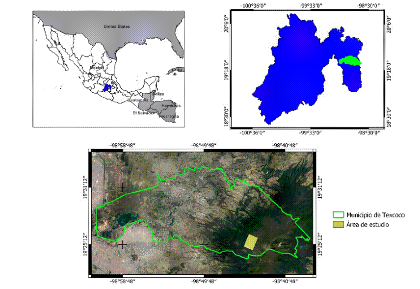 El área de estudio se localiza en el oriente del Valle de México, en áreas forestales de los ejidos Tequexquinahuac y San Dieguito Xochimanca, municipio de Texcoco, Estado de México, México, delimitada por las coordenadas 19° 24´ 58.38”, 19° 26´ 18.53”, 19° 25´ 54.04” y 19° 24´ 33.24” latitud norte y 98° 45´ 24.22”, 98° 44´ 48.95”, 98° 43´ 47.43” y 98° 44´ 22.88” longitud oeste (Figura 1), y comprende una superficie de 500 ha, con una altitud entre los 3350 y 3790 m. El clima predominante es C(W0)(w)b(i’)g según la clasificación de Köppen modificado por García (2004), que representa un clima templado subhúmedo con lluvias en verano, con una temperatura media anual entre 10 y 14°C y una precipitación media anual de 700 mm (Sánchez-González y López-Mata, 2003).