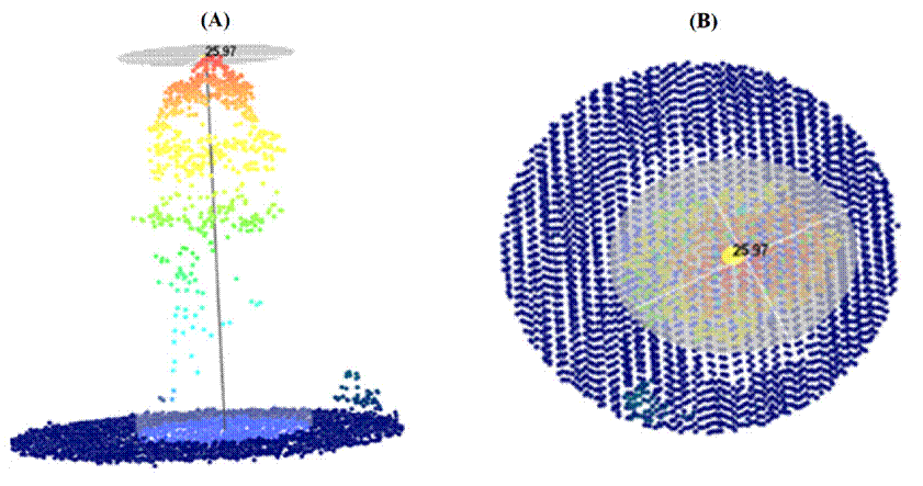 Con las coordenadas de cada uno de los árboles, obtenidas de la ortofoto digital, se identificaron en el conjunto de datos LiDAR los individuos seleccionados mediante la opción muestreo al punto de interés más cercano (POI, por sus siglas en inglés). A cada árbol se le midieron tres variables dasométricas en los datos LiDAR: altura total (ATL, m), altura del fuste (AFL, m) y diámetro mayor y menor de la copa, obteniéndose el promedio de ellas (DCL, m) (Figuras 2A y 2B).
