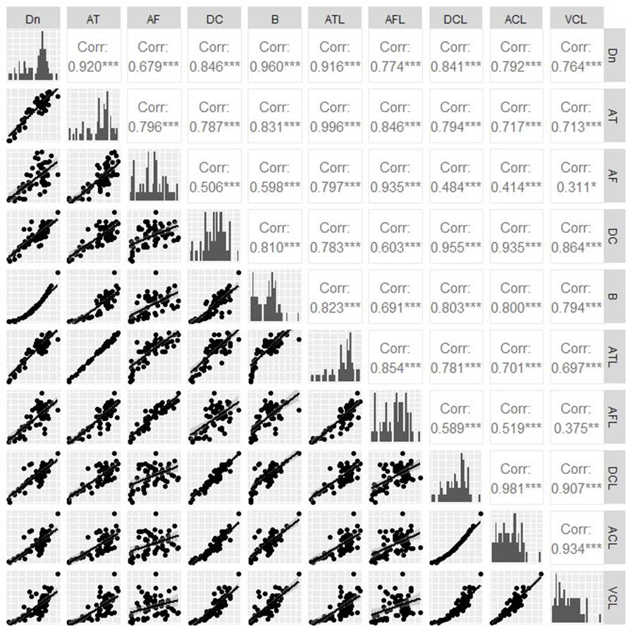 Figura 3 Dispersión y Correlaciones de las medidas en campo y en datos LiDAR. Dn: diámetro normal, AT: altura total, AF: altura de fuste, DC: diámetro de copa, ATL: altura total LiDAR, AFL: altura de fuste LiDAR, DCL: diámetro de copa LiDAR, ACL: área de copa LiDAR, VCL: volumen de copa LiDAR, Corr: correlación, *: P < 0.05, **: P < 0.01, ***: P < 0.001.
