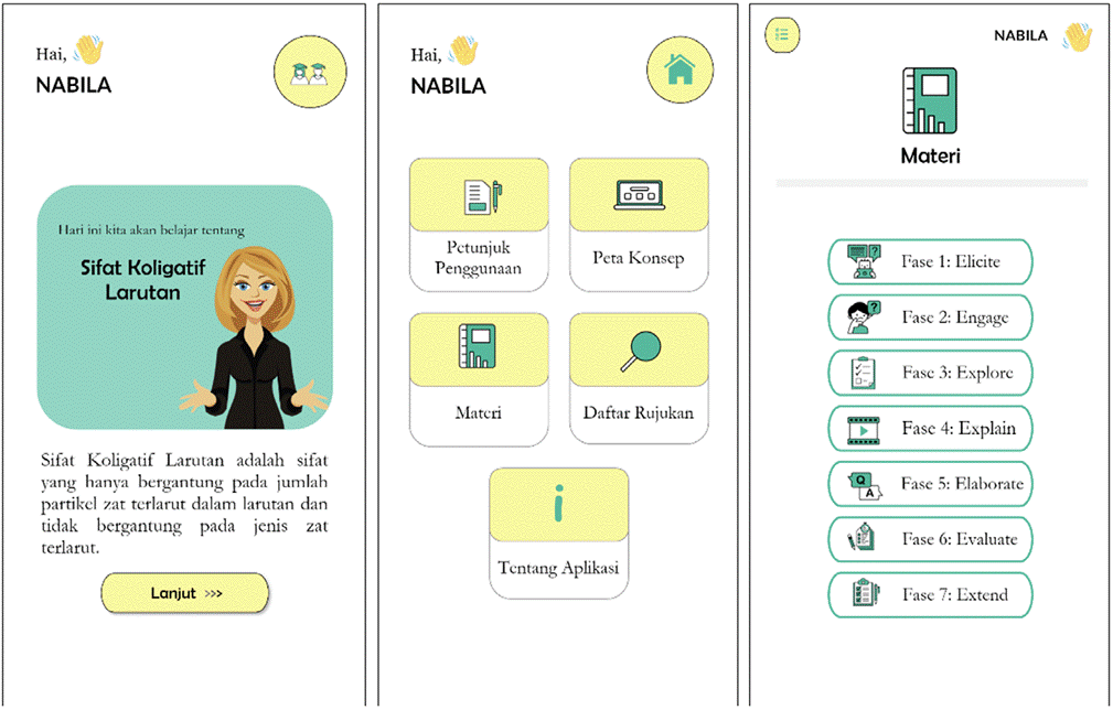 The teaching materials developed are teaching materials in the form of applications that can be accessed using mobile devices with the Android system. As it is known that mobile devices are technology that can be accessed anytime and anywhere (Ling et al., 2014), with this, teaching materials in the form of applications can also be accessed by students easily. Teaching materials are developed for the colligative properties of solutions and are equipped with multiple representations in chemistry. The material in the teaching materials is presented with the syntax of the LC 7E learning model. The display of teaching materials is presented in Figure 1.