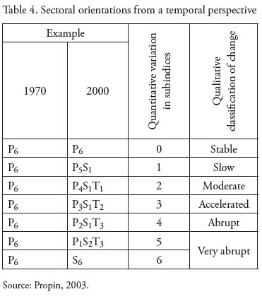 Interpretation of the results. The codes obtained reflect distinct states of specialization (P6 ... S6 ... T6) or of diversification (P2S2T2) that can be explored in relation to the urbanizationtertiarization, industrialization or other processes characteristic of the area studied (Table 3). Also, this tends to contrast the corresponding results from different years and to signal the modifications caused in the municipalities involved (Table 4). The presence of the same code on the initial and final dates represents a stable productive orientation; variation by one quotient is a slow change; when two are modified, moderate; in the case of three, accelerated; the variation of four, abrupt; and the change of five or six quotients, very abrupt (Propín, 2003). The increase or decrease in quotients constitutes an alternative method that provides a criterion for revealing the gaining or losing sector(s). On this occasion, the expression slightly favoured was used to refer to the sectors that, in 2000, had one quotient greater than in 1970, favoured if they had 23 more, and very favoured if they had gained more than three.