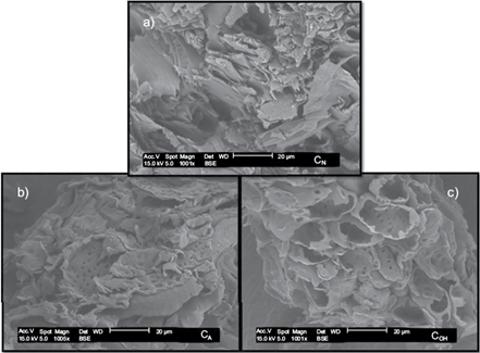 Se considera que el lavado con la solución de NaOH es más agresivo con el material CN debido a la decoloración que este sufrió y que se mencionó anteriormente. Se sabe que este hidróxido reacciona con grupos funcionales presentes en materiales lignocelulósicos y por ende podría influir positivamente en la generación de mayor cantidad de sitios activos superficiales. La micrografía de este material (Fig. 1c) muestra en su superficie los poros, pero también se observó formas diferentes de poros tipo cavidades, es decir, como cuencas.