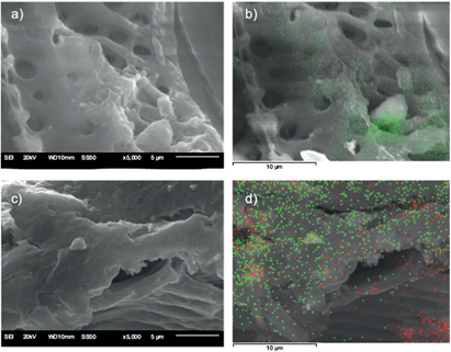 Fig. 3 Micrografía y mapeo químico del material COH después de la adsorción de Cu2+ (a, b) y después de la adsorción de F- (c, d).