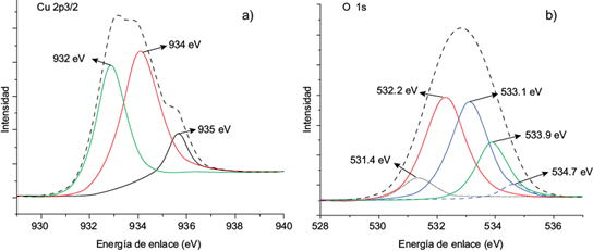 Fig. 4 Deconvolución gausiana de los picos del Cu 2p3/2 (a) y O 1s (b) obtenidos de los espectros de la superficie del material COH después de realizada la adsorción de Cu2+