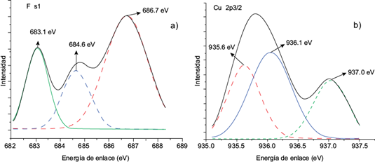 Fig. 5 Deconvolución gausiana de los picos del F (a) 1s y Cu 2p3/2 (b) obtenidos de los espectros de la superficie del material COH después de realizada la adsorción de Cu2+ y F-