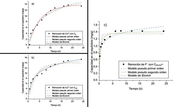 Fig. 6 Cinética de adsorción de Cu2+ sobre CA (a), sobre COH (b) y adsorción de F- sobre COH-Cu2+(c)