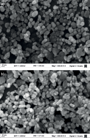 SEM images obtained of the freshly prepared NPs suspension showed free particles that had an average size of 30 ± 8 nm, while agglomerates/aggregates were within the size range 200 to 1600 nm (Fig. 1a). After 15 days of being prepared, the average particle size was similar to the size in the freshly prepared stock solution (34 ± 7 nm) (Fig. 1b).