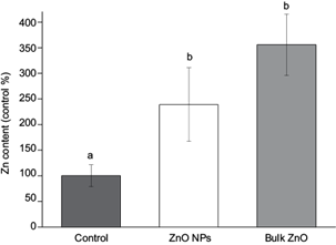 Fig. 2 Zn levels (expressed as control%) in B. glabrata exposed to ZnO nanoparticles (NPs) or bulk ZnO for 48 h. Each data represents the mean value ± SD (n = 3). Different letters indicate significant differences (p < 0.05). Control levels: ZnO nanoparticles (39 ± 8) µg Zn/g (wet weight); bulk ZnO (19 ± 3) µg Zn/g (wet weight).