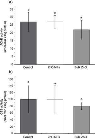 Previous studies have suggested that under in vitro conditions, Zn can act as an inhibitor of AChE enzyme activity (Frasco et al. 2005). In addition, other metal oxide NPs (SiO2 or Al2O3) have a low capacity to inhibit the activity of this enzyme (Wang et al. 2009). However, through in vivo studies with ZnO NPs, no significant modifications of AChE activity were reported in the aquatic polychaete Hediste diversicolor (Nereididae, Annelida), neither in the clam Scrobicularia plana (Semelidae, Mollusca) due to exposure to sediments contaminated with 3 g NPs/kg for 16 days (Buffet et al. 2012) nor in the clam Ruditapes philippinarum (Veneridae, Mollusca) exposed to 1 or 10 µg/L for three or seven days (Marisa et al. 2016). Similarly, no modifications in AChE activity, which could trigger a process of neurotoxicity, were found in ZnO (NPs or bulk) exposed B. glabrata. CES were proposed as toxicity markers in aquatic animals for several xenobiotics (Cacciatore et al. 2018, Solé and Sanchez-Hernandez 2018, Mrdaković et al. 2023). Nevertheless, no changes in CES activity were observed in B. glabrata under present assay conditions.