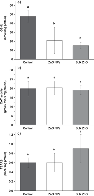 Fig. 4 (a) Total glutathione content (GSHt, n = 3), (b) catalase (CAT, n = 6) activity and (c) lipid peroxidation (TBARS, n = 3) in B. glabrata exposed to ZnO nanoparticles (NPs) or bulk ZnO for 48 h. Data are expressed as the mean value ± SD. Different letters indicate significant differences (p < 0.05).