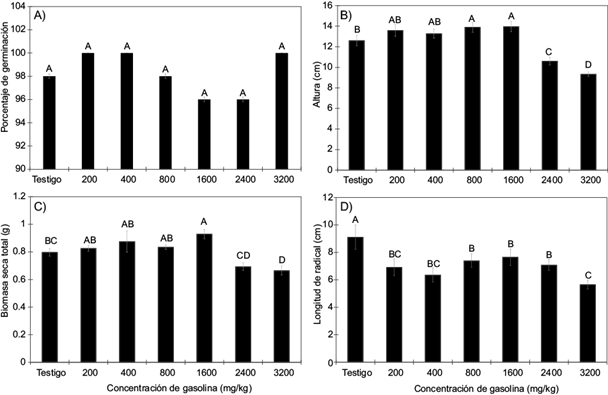 Fig. 1 A) Porcentaje de germinación de semillas de Helianthus annuus L., B) altura de la planta, C) biomasa seca total y D) longitud radical obtenidos en suelo agrícola contaminado con gasolina en condiciones de invernadero, durante 20 días. Barras con letras diferentes indican diferencias estadísticas (Diferencia mínima significativa, α ≤ 0.05). Medias ± error estándar (n = 5).
