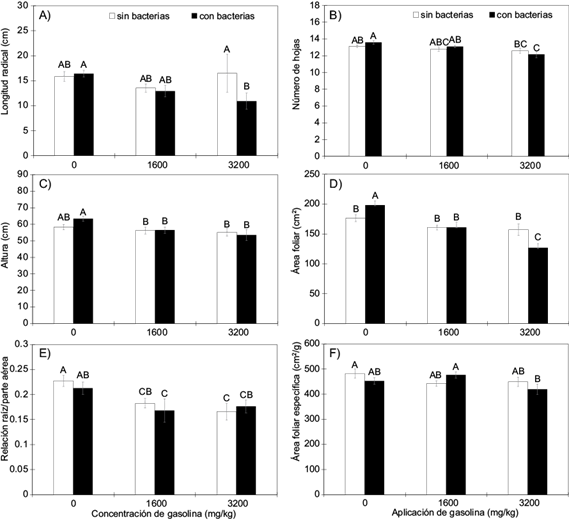Fig. 2 Desarrollo de plantas de Helianthus annuus L. creciendo en un suelo contaminado artificialmente con 0, 1600 y 3200 mg de gasolina/kg de suelo, después de 60 días. A) longitud radical (cm), B) número de hojas C) altura (cm), D) área foliar E) relación raíz/parte aérea y F) área foliar específica (cm2/g). Barras con letras diferentes indican diferencias estadísticas (diferencia mínima significativa, α ≤ 0.05). Media ± error estándar, n = 9.