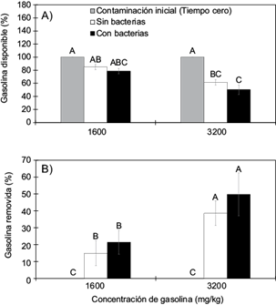 Fig. 4 Efecto de Helianthus annuus L. sin bacterias (barras blancas) y con bacterias (barras negras) sobre: A) contenido de gasolina disponible y B) porcentaje de gasolina removida en un suelo contaminado con 1600 y 3200 mg/kg, después de 60 días. Barras con letras diferentes indican diferencias estadísticas (diferencia mínima significativa, α ≤ 0.05). Media ± error estándar, n =3.