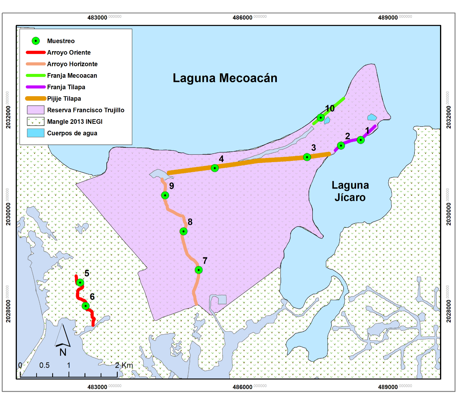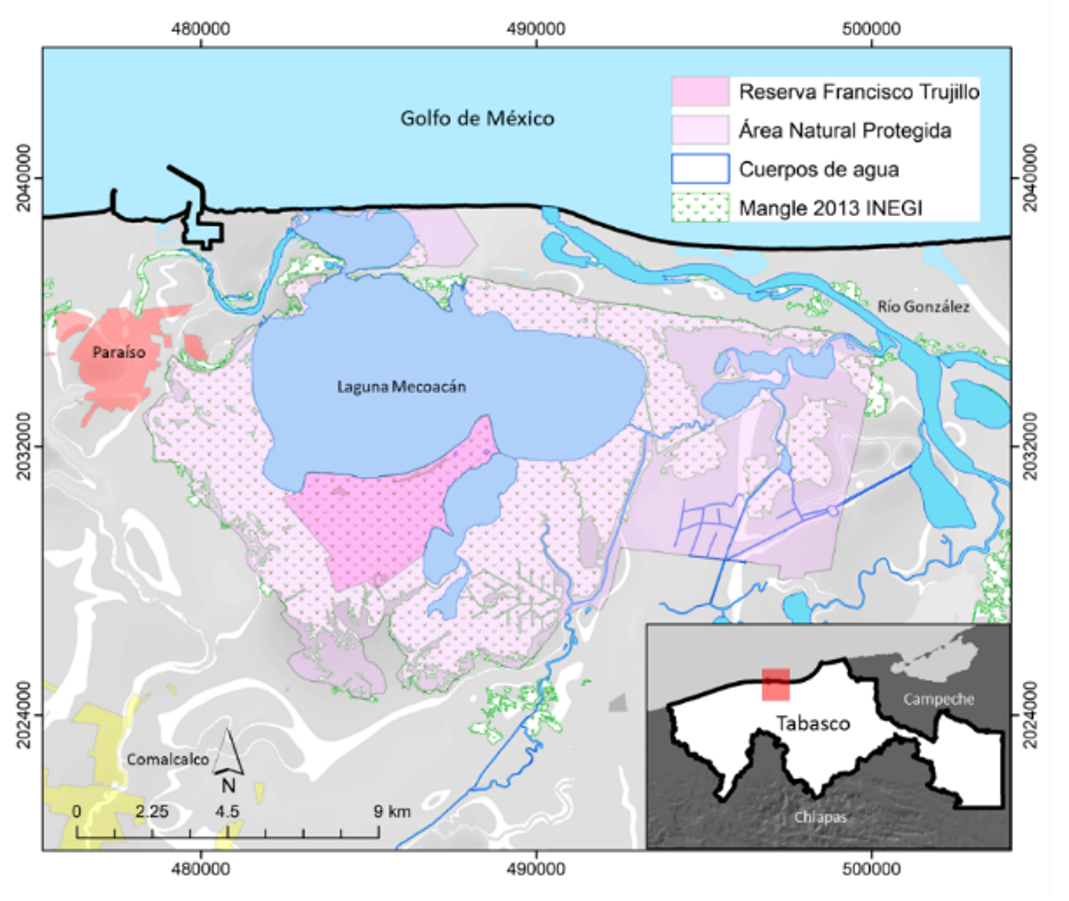 La Laguna de Mecoacán es un ANP que está constituida por diversos ejidos que, a través de sociedades o cooperativas, aprovechan los servicios ambientales. Entre ellos se encuentra el ejido Francisco Trujillo Gurría, que está delimitado por un polígono ubicado en la zona suroeste del cuerpo de agua. El área de reserva de manglar del ejido es de 1278 ha, de las cuales 116 ha corresponden a la zona de estudio (Figura 1) (Conafor, 2022; Domínguez-Domínguez et al., 2011). Actualmente, los ejidatarios trabajan en la línea base para acceder a recursos por certificación de bonos de carbono.