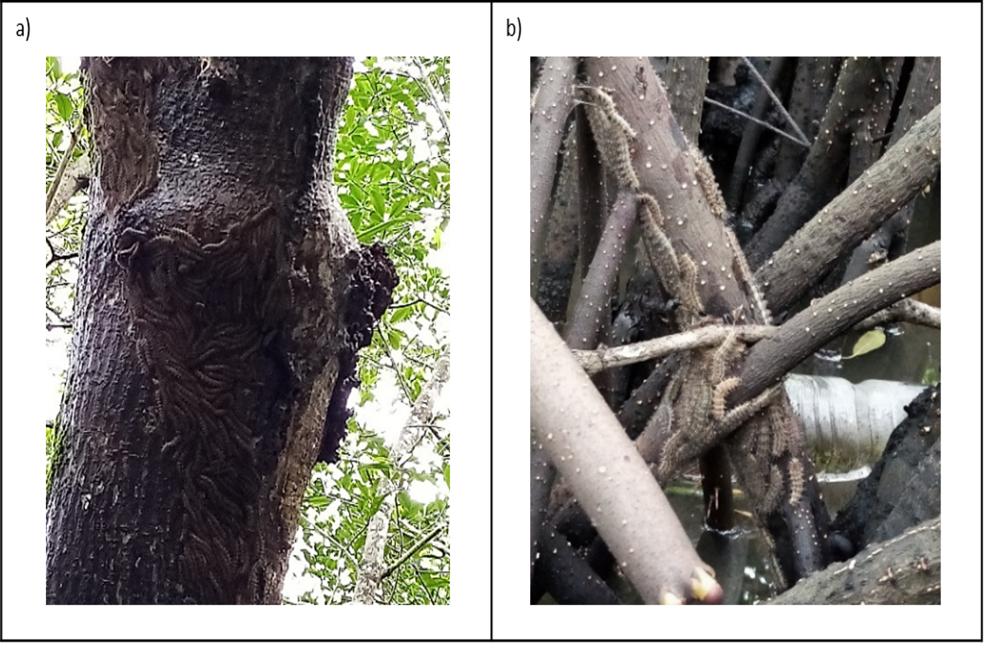 Figura 3 Presencia de larvas de insecto defoliador (lepidópteros) en árboles: a) mangle blanco (Laguncularia racemosa) y b) mangle rojo (Rhizophora mangle).