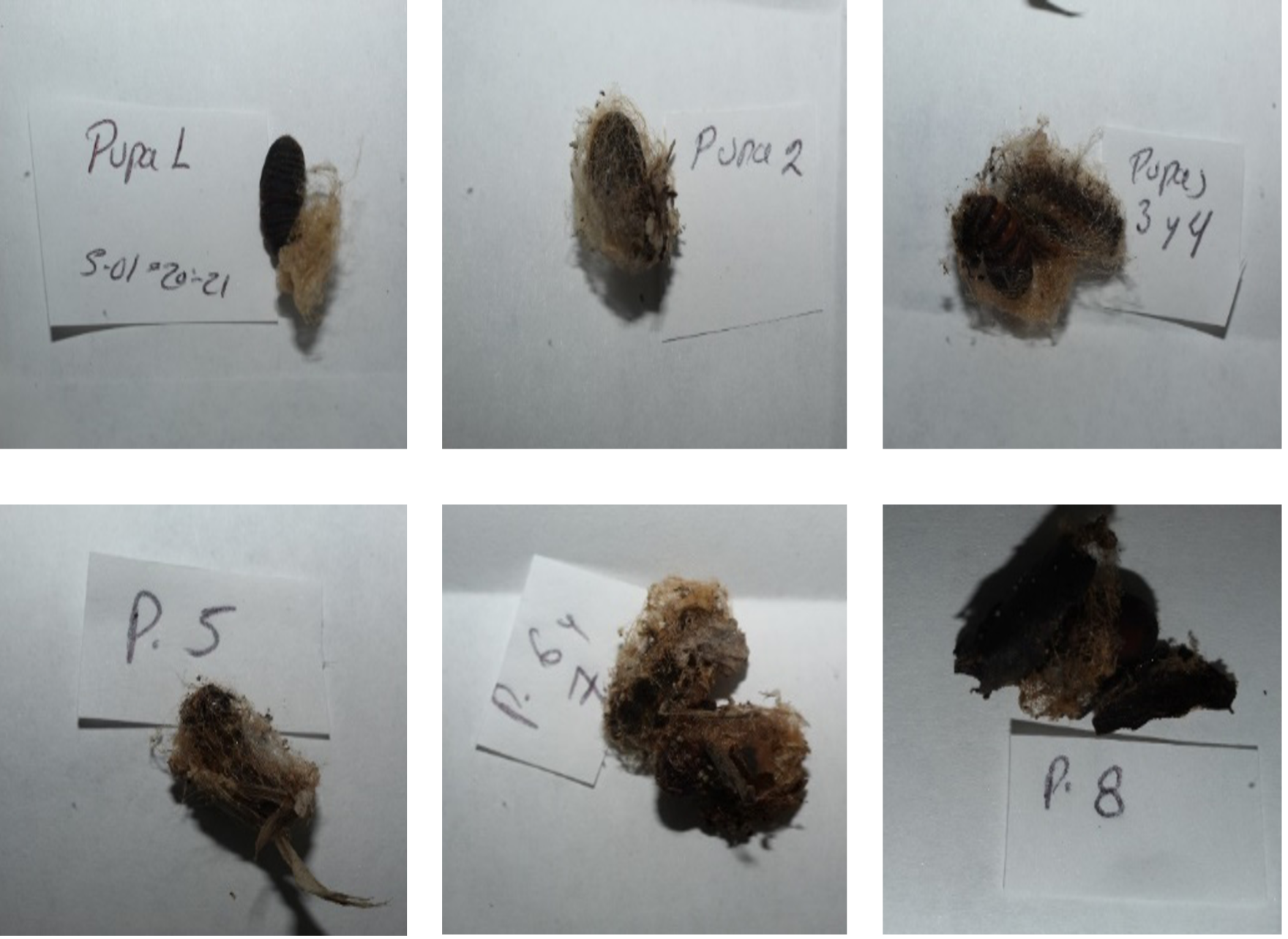 Por otra parte, la mayoría de las larvas recolectadas murieron después de 6 d y solo algunas alcanzaron el estadio de pupa después de 15 d-21 d de observación (Figura 4).
