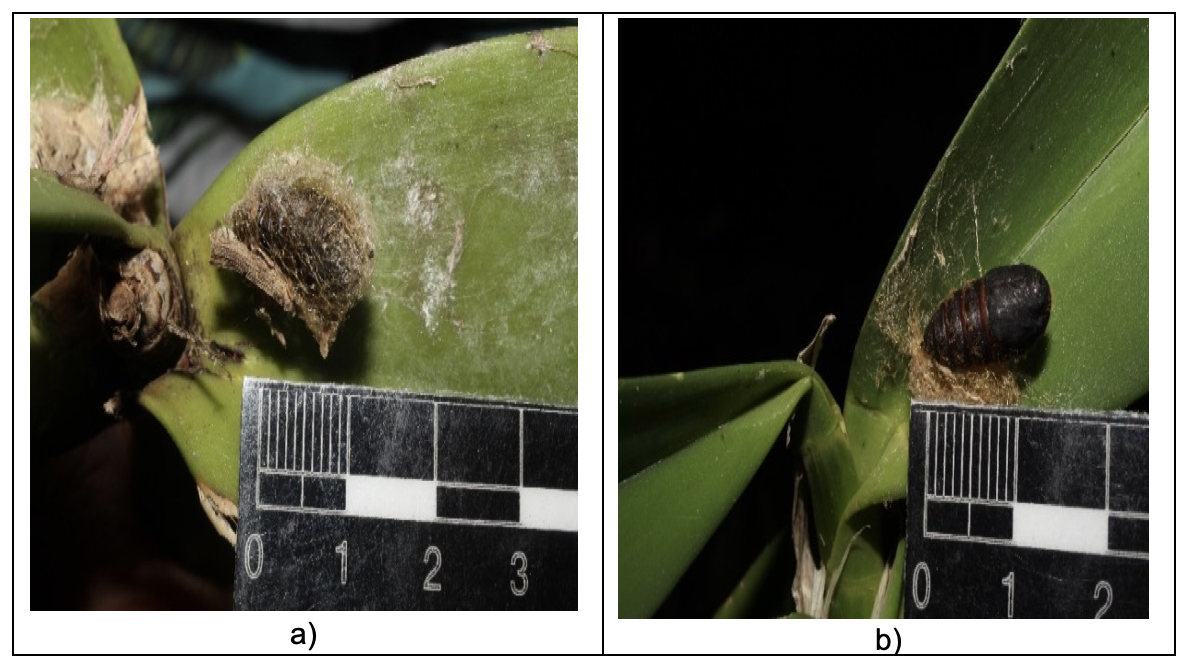 Además, se observaron prepupa en bolsa ambarina (Figura 5a) y pupa de color obscura (Figura 5b).