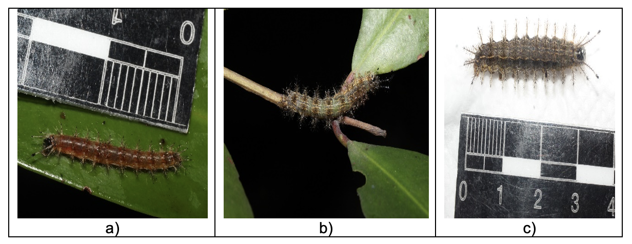 De igual manera, se observó que las larvas se registraron hasta el tercer estadio. Estas tenían una longitud promedio de 16 mm a 17 mm, así como cuerpo con coloración amarillenta y cabeza negra, además tenían espínulas en todo el cuerpo, las cuales fueron urticantes para los pobladores del sitio de estudio (Figura 6a). En el penúltimo estadio las larvas presentaron una longitud promedio de 27 mm a 29 mm y coloración verde oscuro con líneas dorsales oscuras (Figura 6b).