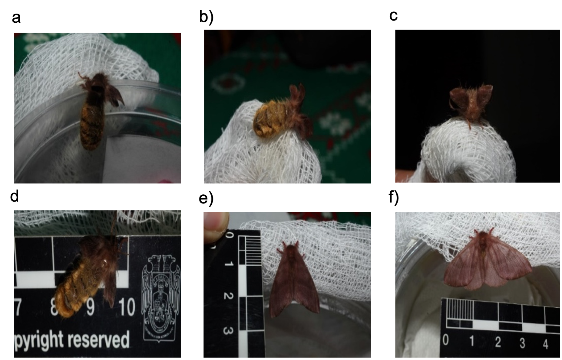 En el último estadio de larva (longitud promedio de 32 mm a 35 mm) se observó coloración negra con líneas pardas oscuras (Figura 6c). Después de ~21 d emergieron dos adultos (Figura 7).