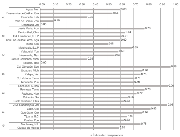 Los resultados expuestos en la Tabla 6 permiten demostrar que, pese a la expedición de un marco normativo a nivel nacional y estatal sobre el acceso a la información y transparencia, y la creación del Instituto Nacional de Transparencia y Acceso a la Información Pública, la transparencia es nominal y no efectiva, pues en cada grupo los OOAyS con calificación baja representan más de 60%, a excepción del grupo G.