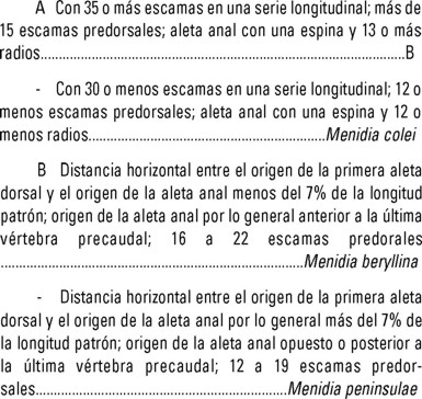 2. Los peces de la Familia Atherinopsidae que se encuentran en las lagunas costeras neutras e hipersalinas de México, se ubican dentro de dos subfamilias: I) Atherinopsinae, que contiene sendas tribus: Atherinopsini con cuatro géneros aquí considerados, y Sorgentinini con dos, cuyas especies habitan las aguas dulces y salobres de Sudamérica. II) Menidiinae, que incluye a dos tribus: a) Menidiini, con dos géneros cuyas especies habitan las aguas dulces del altiplano mexicano (Chirostoma Swainson, 1839 y Poblana De Buen, 1945) no tratadas aquí, al igual que Labidesthes, Cope, 1870, de los Grandes Lagos, río San Lorenzo y en aguas dulces y salobres de la costa oeste de Florida, E.U.A.; Menidia, Bonaparte, 1836, con tres formas costeras y b) Membradini, que contiene tres géneros: a) Atherinella, Steindachner, 1875, con una en estos ambientes, varias nominales y muchas todavía no descritas en áreas dulceacuícolas y mixohalinas de ambas vertientes de América tropical; b) Membras, Bonaparte, 1836, con dos y una en los sistemas estuarino lagunares tropicales del Atlántico occidental y del Pacífico oriental, respectivamente; c) Melanorhinus, Metzelaar, 1919, con varias descritas, aunque solo una reconocida en la costa del Pacífico tropical de México, Costa Rica y Panamá.