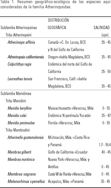 Por otra parte, desde el punto de vista biogeográfico, las especies de la Tribu Atherinopsini, Subfamilia Atherinopsinae, objeto de este estudio, son características del Pacífico nororiental e incluso con un elemento endémico de la parte centro-norte del Golfo de California, además de que no tienen representantes en el Atlántico occidental. Por el contrario, la Tribus Menidiini y Membradini, Subfamilia Menidiinae, están conformadas por cinco especies con una distribución euritérmica templado-tropical en el Atlántico noroccidental, tres estenotérmicas tropical-subtropicales en el Pacífico oriental tropical e inclusive una restringida en el norte de la península de Yucatán. En este caso, tampoco existen formas anfiamericanas. En la tabla 1 se ofrece una síntesis geográfico-ecológica de cada una de las especies consideradas y arregladas en el órden sistemático de Dyer & Chernoff (1996: 4).