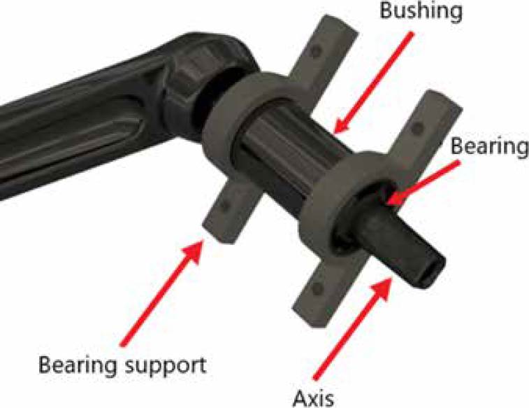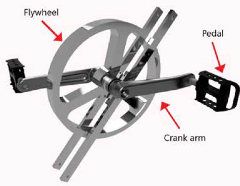 The transmission system comprises the flywheel, two crank arms with their respective pedals, an axle, a bushing, and two bearings with their respective supports (Figures 11 and 12). The movement is generated in the inertia disk, which has a mass of 6 kg (recommended for the selected user, the older adult [22]). For the dimensions a commercially available flywheel [23] was considered, making the verification of the mass and dimensions through the CAD model. The outer diameter was defined as 280 mm and the inner diameter (joint to bushing) as 30 mm. Table 4 includes the specifications of the transmission system elements that were selected, considering commercial availability and adaptation to the dimensions of the inertia disk.