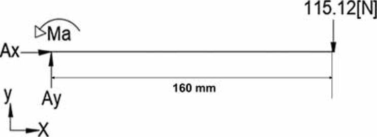 To analyze the brake plate, of cross-section 22x2 [mm], it was considered as a recessed and cantilevered beam, as can be seen in Figure 15, where the 115.12 N actuation force obtained in the previous section is incorporated.