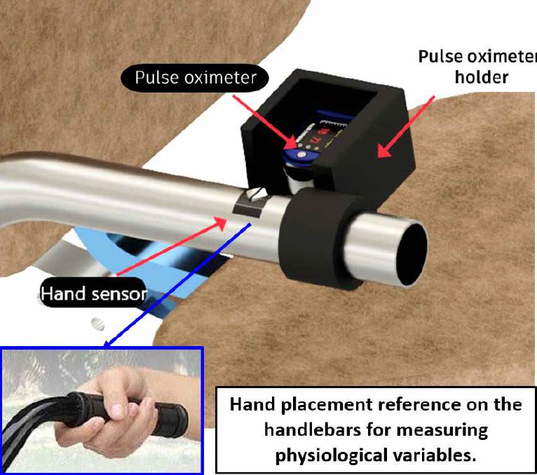 The reading of physiological parameters of older adults when using the bicycle is done in the handlebar area (Figure 16). These are elements that have sensors for the measurement of heart rate and respiratory rate. Oxygen saturation is read by a pulse oximeter, which is attached to the handlebar through a "pulse oximeter holder" because the measurement is done on the index finger, this pulse oximeter holder will be manufactured with additive manufacturing. Once the heart rate sensor is incorporated, it must be connected to a microcomputer that processes the reading and then, through an HDMI connector, sends the results to the screen so that the user can see the respective values.