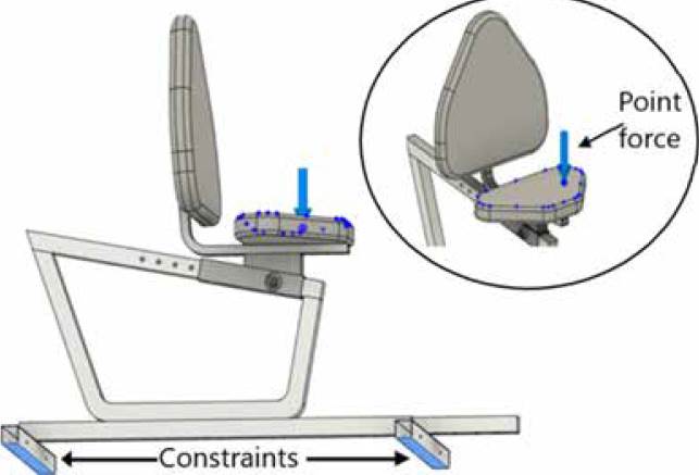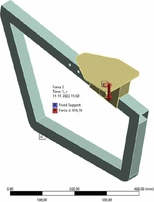 For the stress analysis of the structure, a static, linearelastic model was considered, disregarding the cyclic loads resulting from the movement of the pedals. As acting loads, the user's weight applied vertically, eccentrically (away from the geometric center of the figure) and pointwise (see Figure 18) was considered. This represents the concentration of the entire load on one side of the body when performing the exercise. The point load is shown in Figure 18 with a blue arrow on one side of the saddle and has a magnitude of 814.23 N, representing the user's weight taken as a reference, a body mass of 83 kg. A fixed constraint was included in the lower profiles of the structure, simulating the contact of the device with the ground, and the condition of perfect contact or rigid bonding (bonded) was used in the union of all parts. Table 7 shows the mechanical properties of the elements involved in the study.