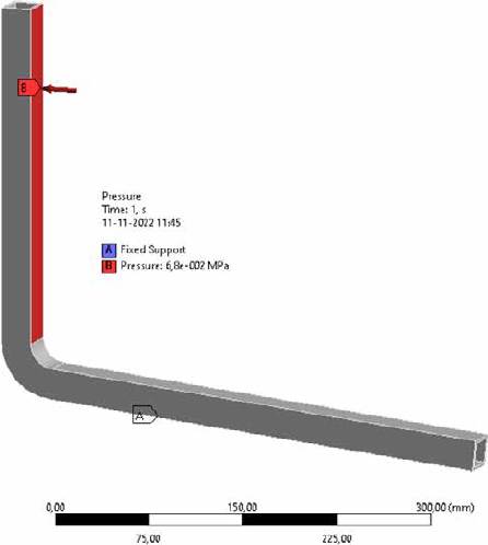 Regarding the back support bar structure, designed in A-36 steel, an unfavorable condition was considered, which is that the user applies all his weight on the backrest area (see Figure 20). This is equivalent to a pressure distributed in the area of 0.068 MPa. The restriction corresponds to a fixed support and is located in the area where this bar comes into contact with the saddle support structure.