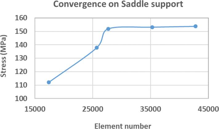 For the saddle bar structure, 10-node tetrahedral elements were used. The von Mises stress and a stress variation of less than 2% were established as convergence parameters. From the analysis performed, the number of elements was set at 35421. Figure 21 shows the final mesh and Figure 22 the convergence graph.