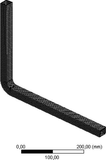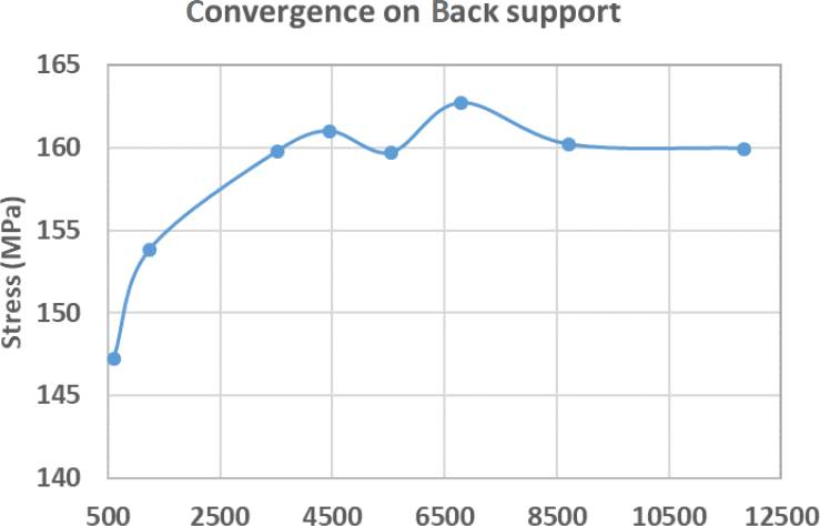 Hexahedral solid elements of 8 nodes were used for the back support bar structure. The same criterion was used for convergence as for the saddle support bar structure, setting the number of elements at 8663. Figure 23 shows the final mesh, and Figure 24 shows the convergence graph.