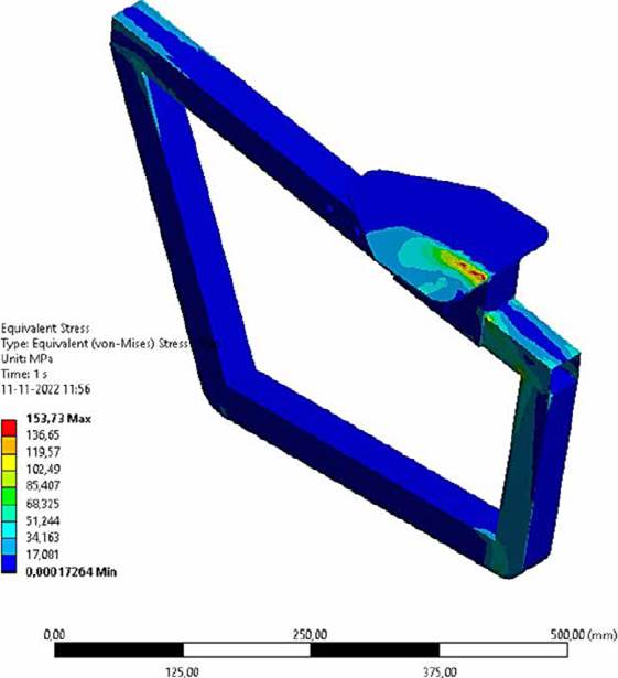 In the structural evaluation, the von Mises stresses, a factor of safety, and maximum displacements were verified. Figure 25 shows the von Mises stress distribution of the saddle support bar structure, where a stress concentration is observed in the aluminum bar, mainly on the corners. A stress concentration is also observed at the load application point. Figure 26 shows the von Mises stress distribution of the back support bar structure. This time the stress concentration is evident in the area of change of direction of the bar. The maximum von Mises stress is 168 MPa.